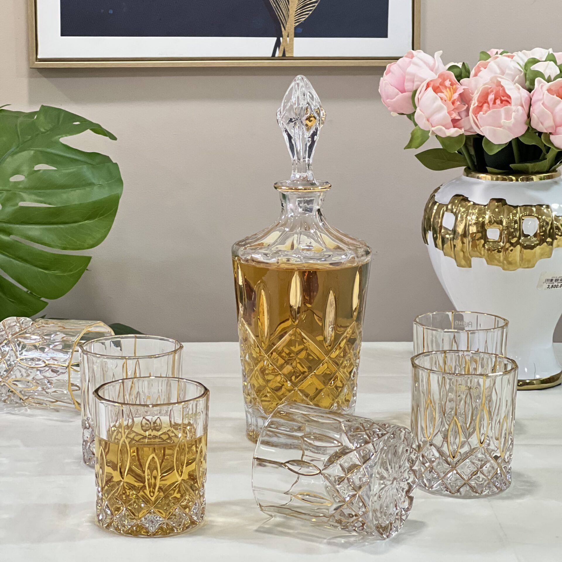 Service à eau 7 pièces comprenant une carafe et 6 verres détails finement sculpté et incrusté d’un fil dorée.