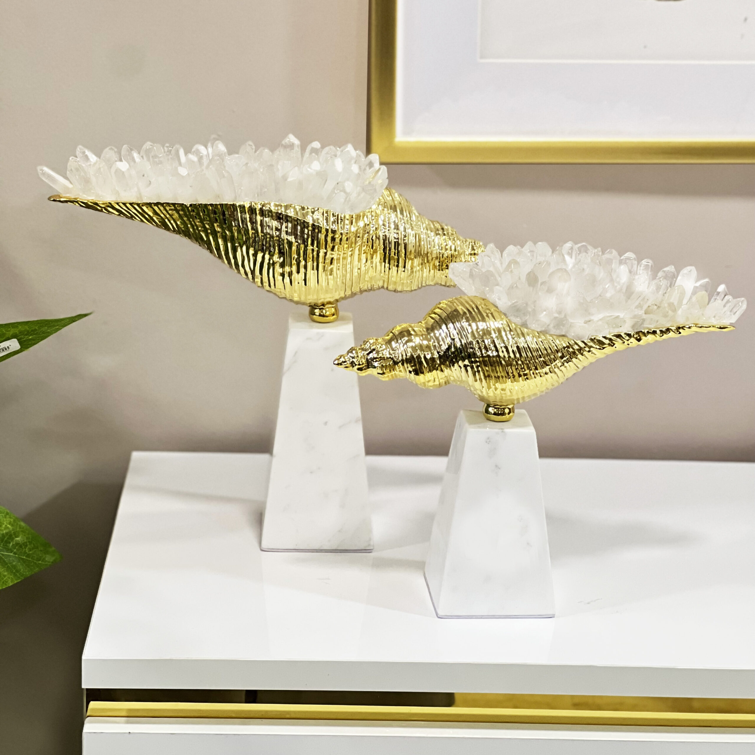 Apportez du style a votre intérieur avec cette magnifique pièce de garniture à poser socle en marbre de carrare coquille en acier inoxydable surmonté de pierres inspiration quartz.
